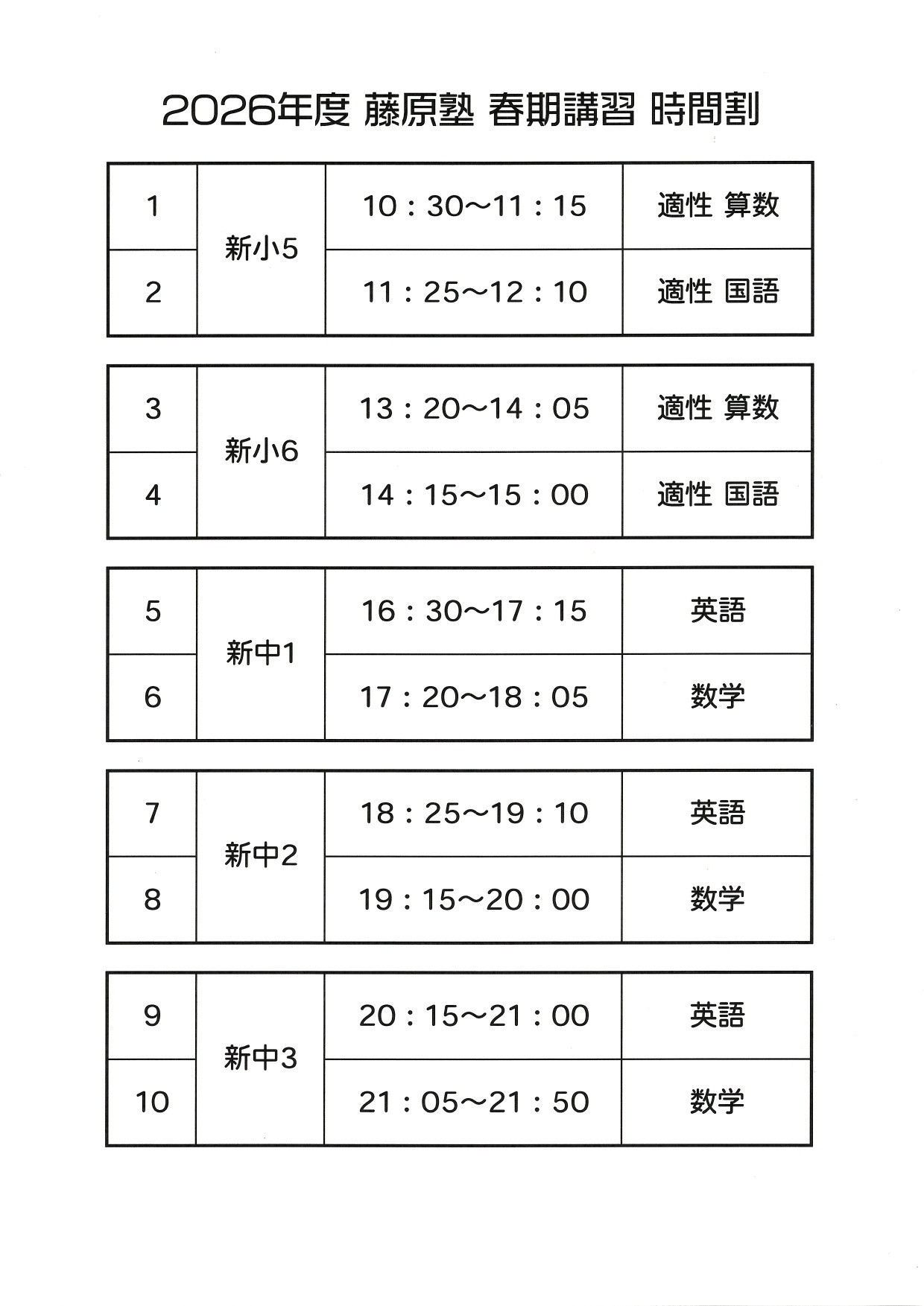 時間割については下記の「2026年度 藤原塾 春期講習 時間割」をご参考ください。